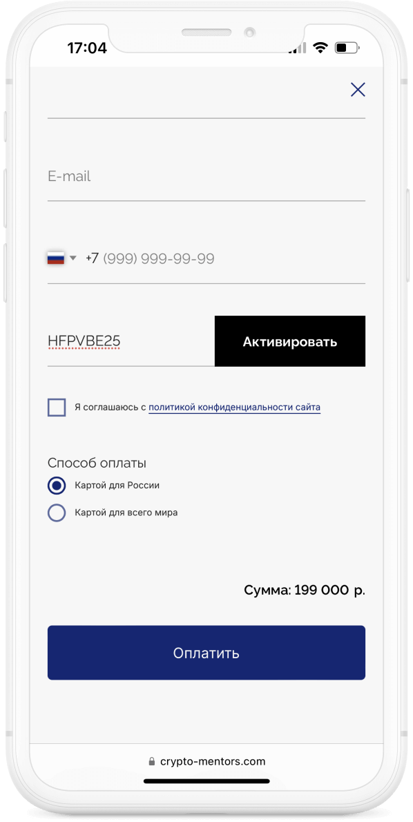 Заполняете анкету: ФИО, номер телефона и почту; подтверждаете свои данные.